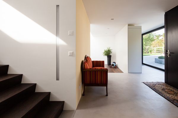 mit Garderobe, Verbindung zur Garage und Bürozimmer liegt auf dem Niveau der Garagenrampe. Es ist der öffentliche Teil des Einfamilienhauses. Mithilfe des Splitlevels wird das Haus in öffentliche und private Bereiche zoniert. Zwei Treppenläufe führen nach unten in den Wohn-, Küchen- und Essbereich, ein Treppenlauf führt nach oben zum Schlafzimmergeschoss.