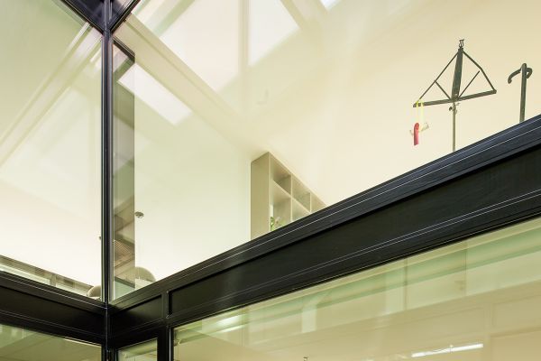 des Erdgeschosses bieten einen Sonnenschutz und filtrieren das Licht aus Südwesten, so dass die Lichtstärke im Innenraum verringert wird. Auf diese Weise wird das Licht, welches vom Lichthof und vom Oberlicht her eindringt, verstärkt und die dunkleren Bereiche des Erdgeschosses werden erhellt. Es wird eine spannende Stimmung erzeugt. Das Erdgeschoss wird in sich geschlossen und die Verbindung zur Aussenwelt sind nur noch über die zwei anderen natürlichen Lichtquellen gegeben.