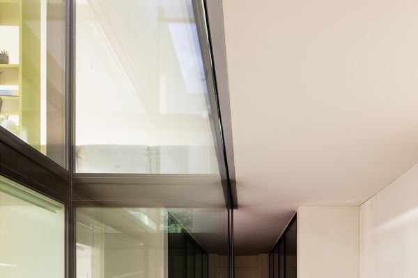 lässt sich zur Terrasse hin komplett öffnen, so dass wiederum der Aussenraum in das Einfamilienhaus eindringen kann. Im offenen Zustand verwandelt sie sich in einen geschützten Aussenbereich, geschlossen spielt sie eine Wechselwirkung zwischen Essen und Wohnen.